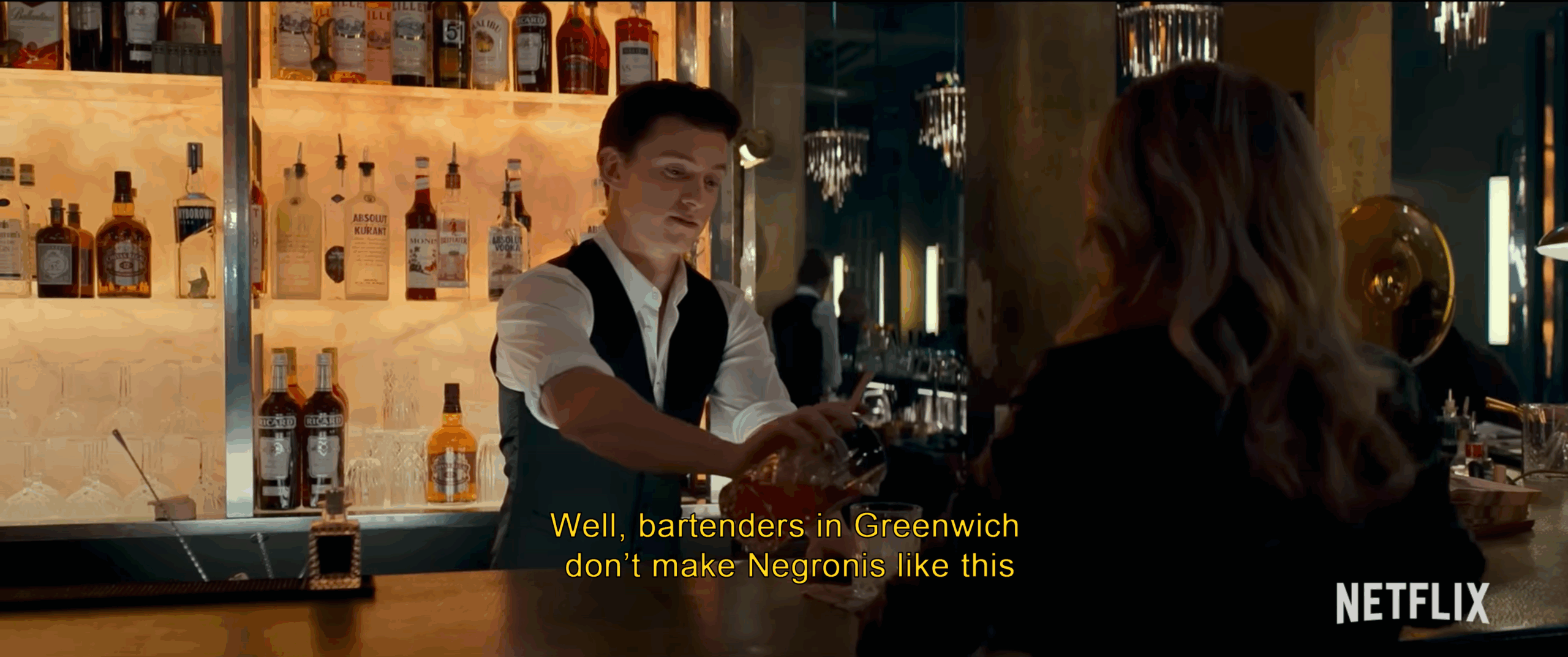 On the other side, Uncharted (2022) actually gets it right. Tom Holland (aka Peter Parker) plays Nathan Drake and makes a Negroni behind the bar. He doesn’t shake it. He doesn’t fumble it. He just gives it the calm, proper stir it deserves — and still looks cool doing it. Proof that bartender swagger doesn’t require a dramatic shaker routine.