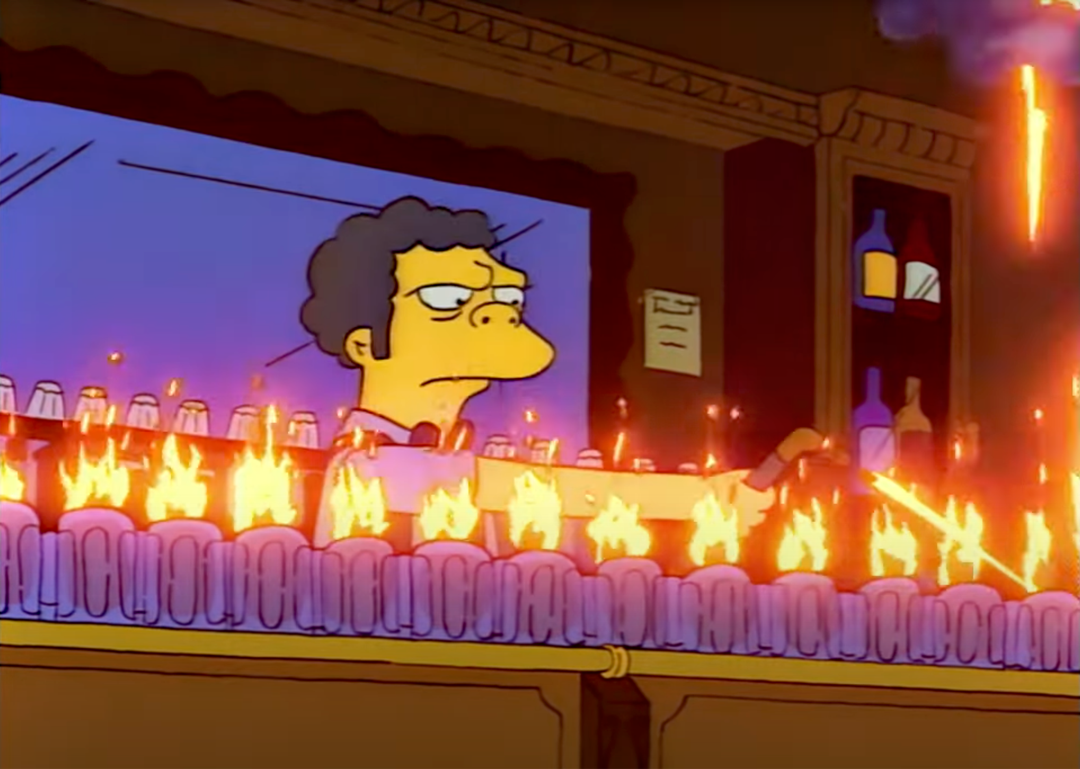 Or The Simpsons’ legendary “Flaming Moe’s” (1991), where Moe lights up a whole row of drinks with a torch. Iconic TV, sure — but also a fire departments’ nightmare.